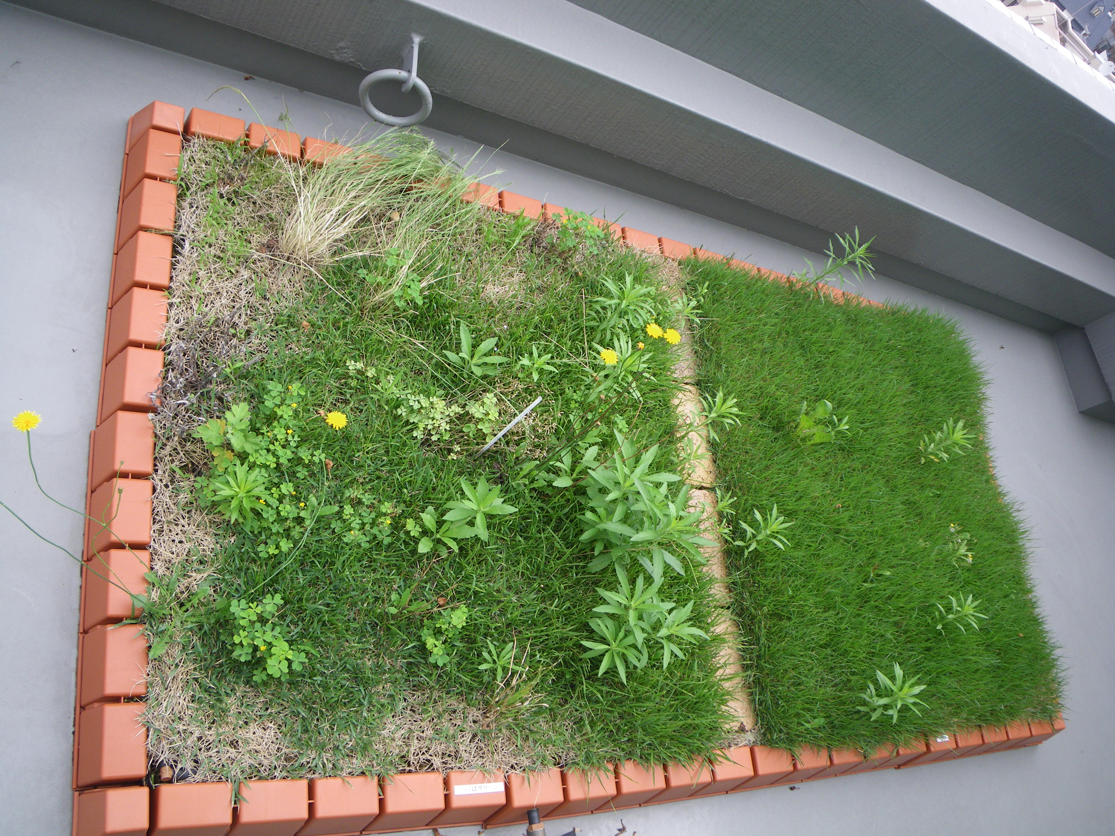 植物の種類や大きさにより重量が異なります。重量の大きい植物を支える為には、建物の構造をより丈夫なものとする必要が有るのです。軽量土壌でも生育可能な植物は芝生系、セダム系、コケ類と色々有りますが、エコヴィレッジでは芝生系の中でも、軽量土壌で良く育ち、寒さにも強く、雑草が生え難いため管理がし易いという利点が有るTM9を採用しています。写真は、蓮根みなみ公園の屋上緑化(冬のTM9、元気に育ってます)です。平成27年1月撮影