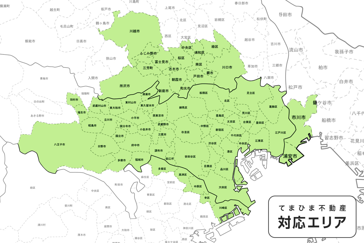 てまひま不動産の対応エリアマップをご確認くださいませ。エリア外での対応をご要望のお客様は、一度フォームよりお問い合わせください。