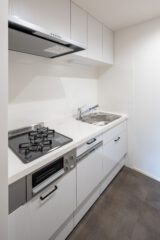 キッチンは独立型。コンパクトながら食器洗い乾燥機もついています。壁にフックを取り付けて吊り下げ収納にするなどの工夫でさらに使いやすくなりそうです。来客時などは出入り口に暖簾やロールクスリーンをつけることでキッチンの生活感を隠すこともできます。