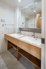 洗面室は、家族が2人並んで使えるように洗面ボウルを2つ設置しました。忙しい朝に大活躍しそうです。洗面台のタイルは天然石材をチョイス。木目の天板・収納の雰囲気に合うナチュラルで上質な空間に仕上がりました。