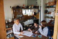 自作の棚やアンティークの小物たちに囲まれたリビング。右からかなさんと旦那さんと、てまひま不動産の設計担当の内田。