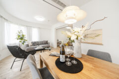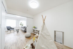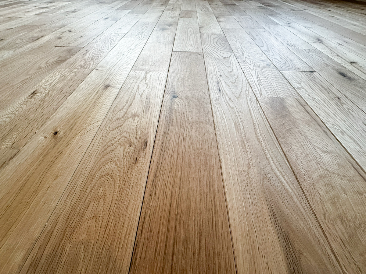 こちらの物件のフローリングには無垢のオーク材を採用しました。無垢の木材には、湿度が高い時には湿気を吸い、乾燥している時には吐き出す「調湿効果」があります。これにより、夏はさらっと涼しく、冬はほんのりあたたかい足触りが感じられます。