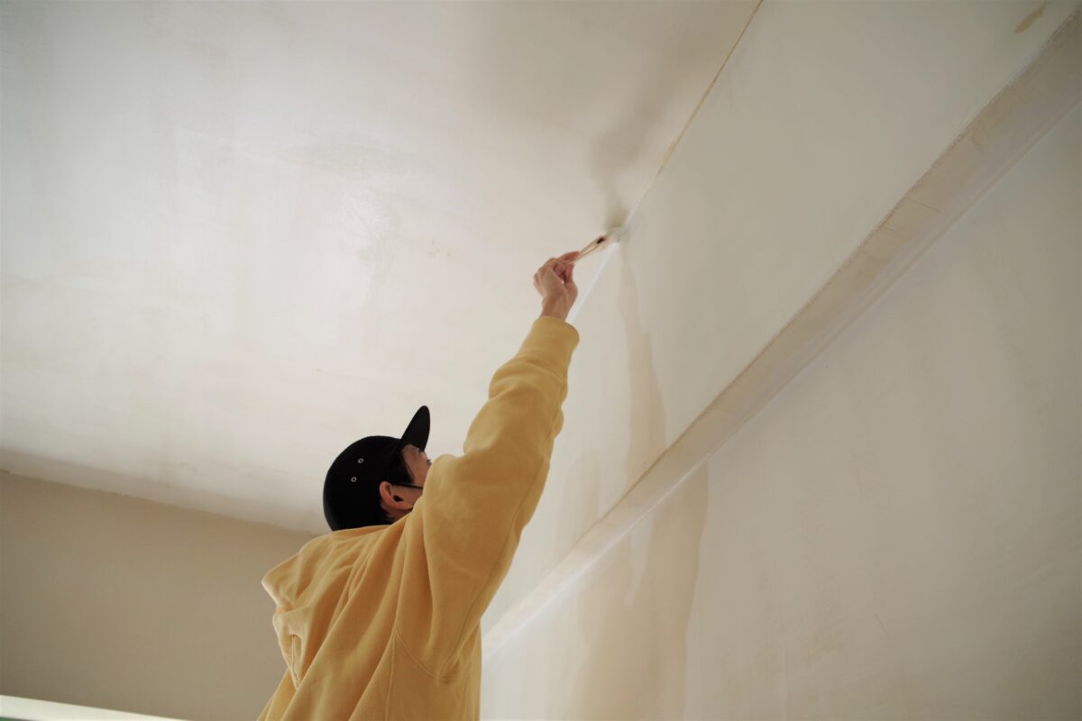 天井も長い柄のローラーを使って塗布。腕の力を使う作業です。