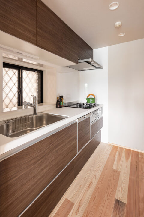 IHコンロの前にはガラスで油はねを抑える工夫がされ、換気扇もホワイトで統一して清潔感溢れます。リビングスペースの奥の壁に通風用の小窓が見えますね。