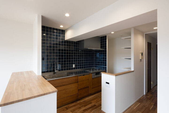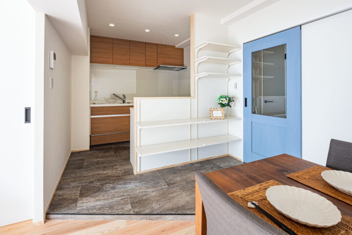 濃いブルーのカウンターがシンクと調理スペースで、背面にコンロが設置されていて動線的にも使い勝手が良さそうです。ます。カウンターの隣にダイニングテーブルを置いて、家族みんなで料理を楽しみながらいただく光景が浮かびます。ブルーが部屋のアクセントとなっている事例です。