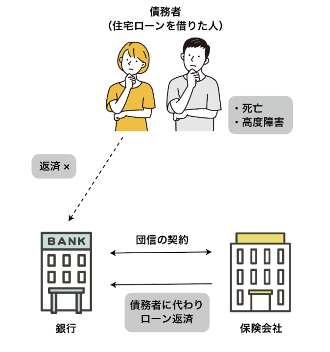 団体信用保険(団信)とは、住宅ローン契約者の万が一に備えて加入する生命保険の一種です。住宅ローンの契約者が返済中に亡くなった、高度障害と診断されローン返済ができなくなった場合などに、残りのローンの返済が免除されます。(保険会社がローン返済)