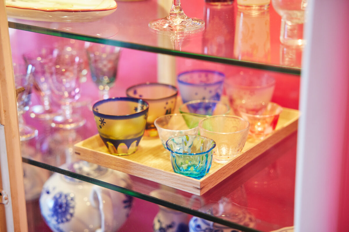リビングに置かれたお気に入りのヴィンテージの食器棚は、大正時代から実際に薬棚として病院で使われていたものをリメイク。来客時に活躍する食器たちが並ぶ。