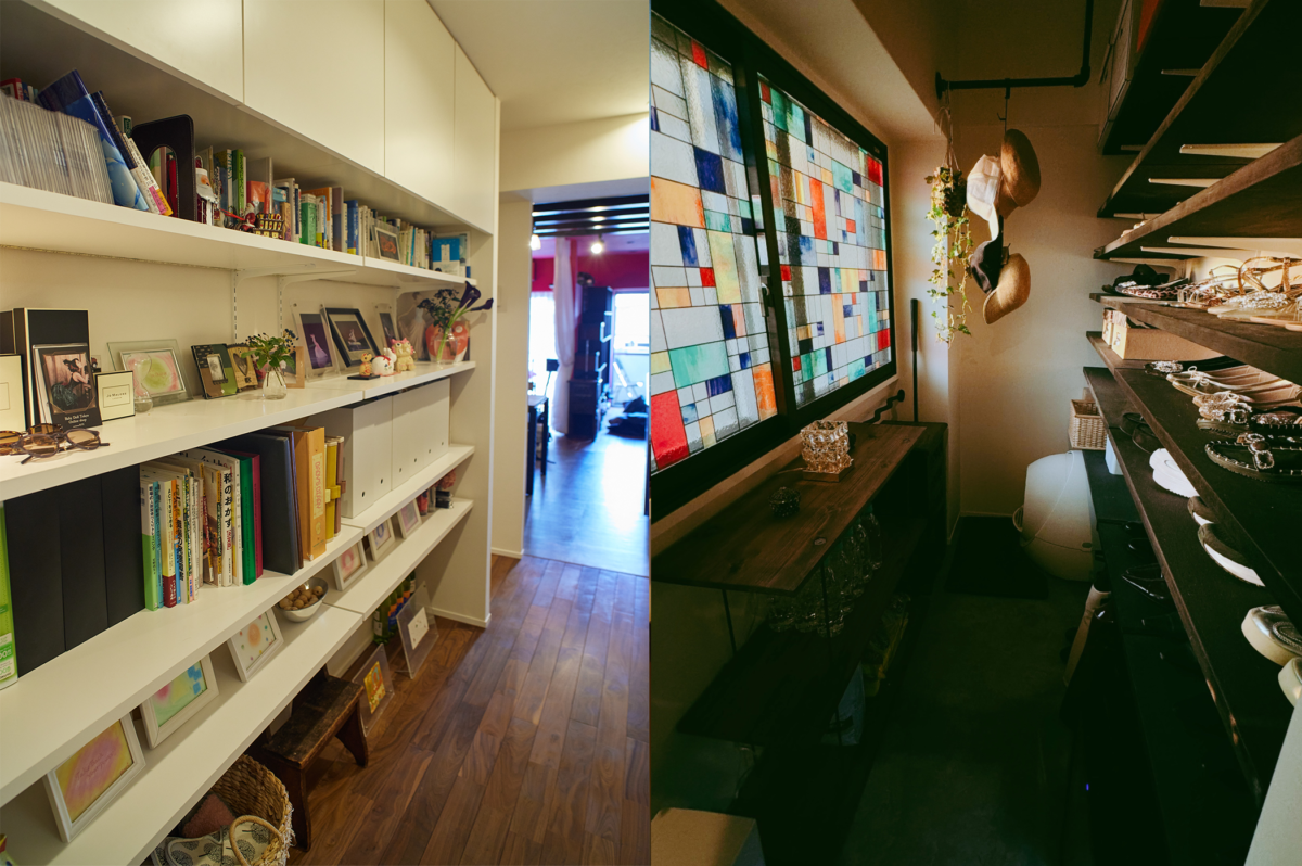 左)内田が「本の回廊」をイメージして造作した大きな棚。右)玄関の土間スペース、靴収納(可動棚)の上には室内窓があり、空気が通るようになっている(提供写真)。