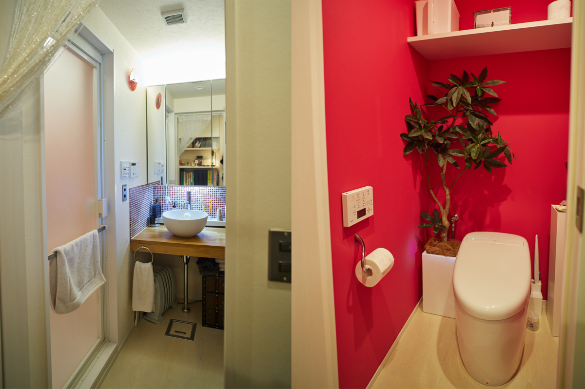 左)洗面台はシンプルでお手入れしやすい設計。右)トイレの壁紙もピンク。アクセントとなっている光触媒加工のフェイクグリーンには消臭・抗菌効果もあるのだそう。