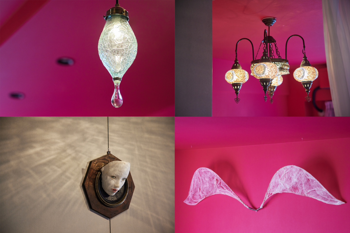 上)照明は空間にあうテイストのものを探して、作家物やトルコランプなど、少しずつ取り揃えていった。下)リビングとダイニングには、絹を扱うお気に入りの造形作家さんの作品が並ぶ。