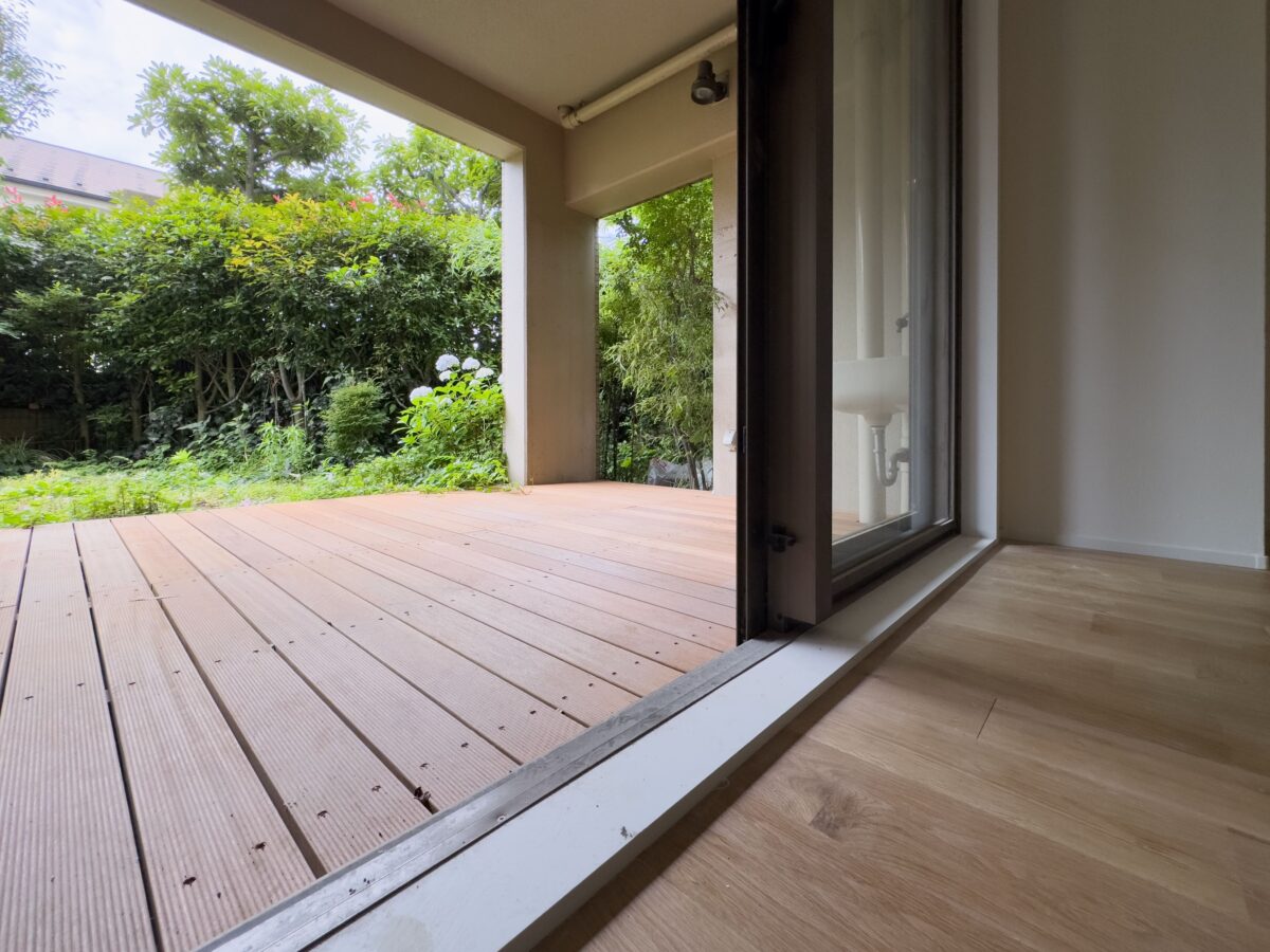 てまひま不動産では、室内で採用した無垢フローリングとの一体感を考え、ウッドデッキの素材、板目の向き、高さを揃えるといった工夫をしています。