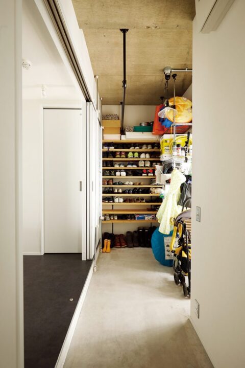 泥だらけの靴やベビーカー、公園で使ったおもちゃ。これらを室内に入れず、土間で一気にケアできる動線を作ります。
