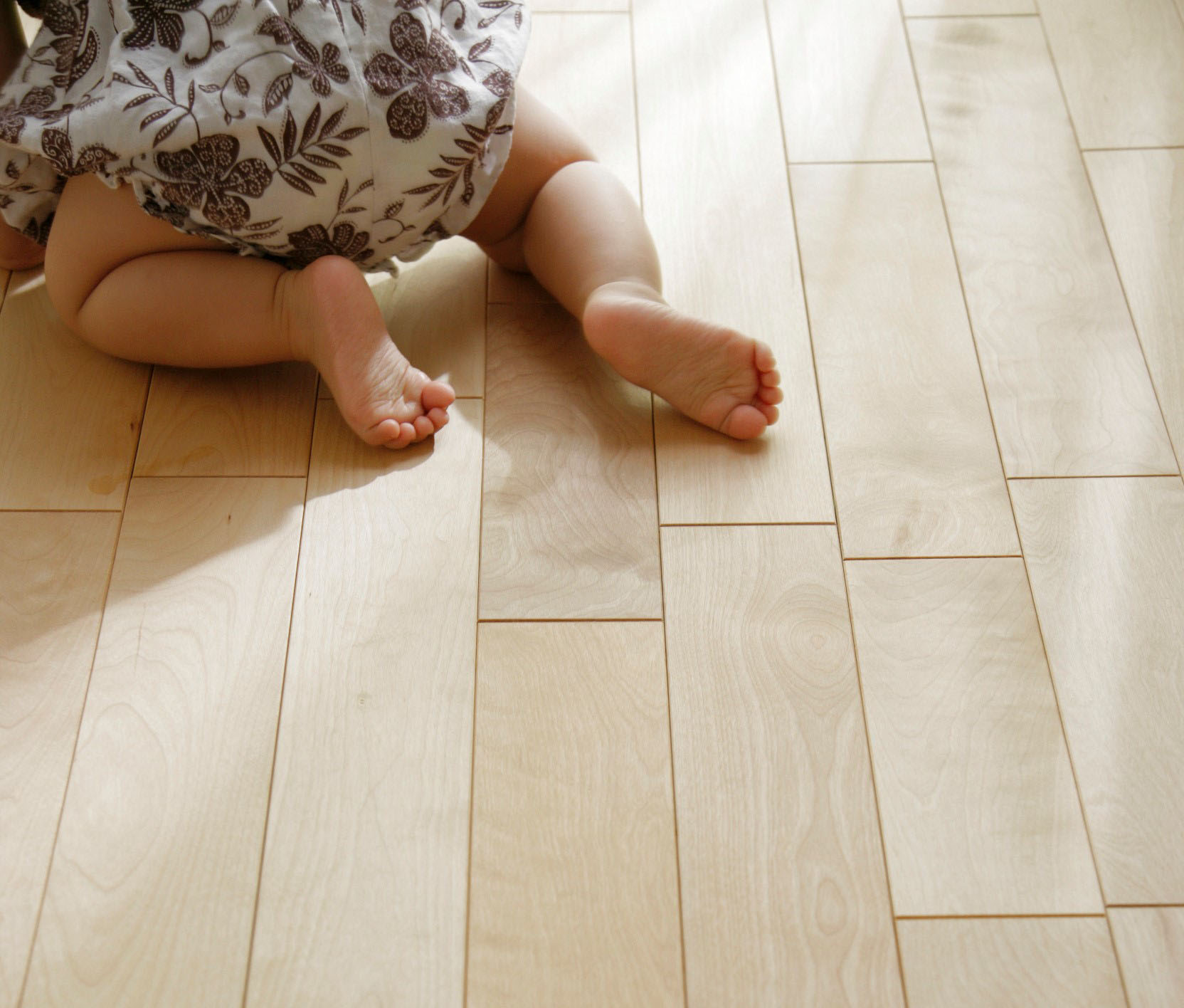 足腰に優しい無垢の杉床は、子どもが転んでも衝撃を和らげ、夏はサラリと冬は温かく、素足でのびのび過ごせます。