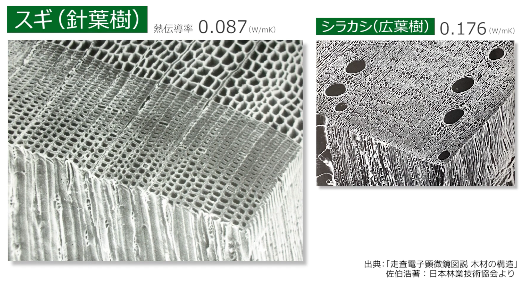 杉は、広葉樹のシラカシと比べ、無数に穴が開いているのが分かります。