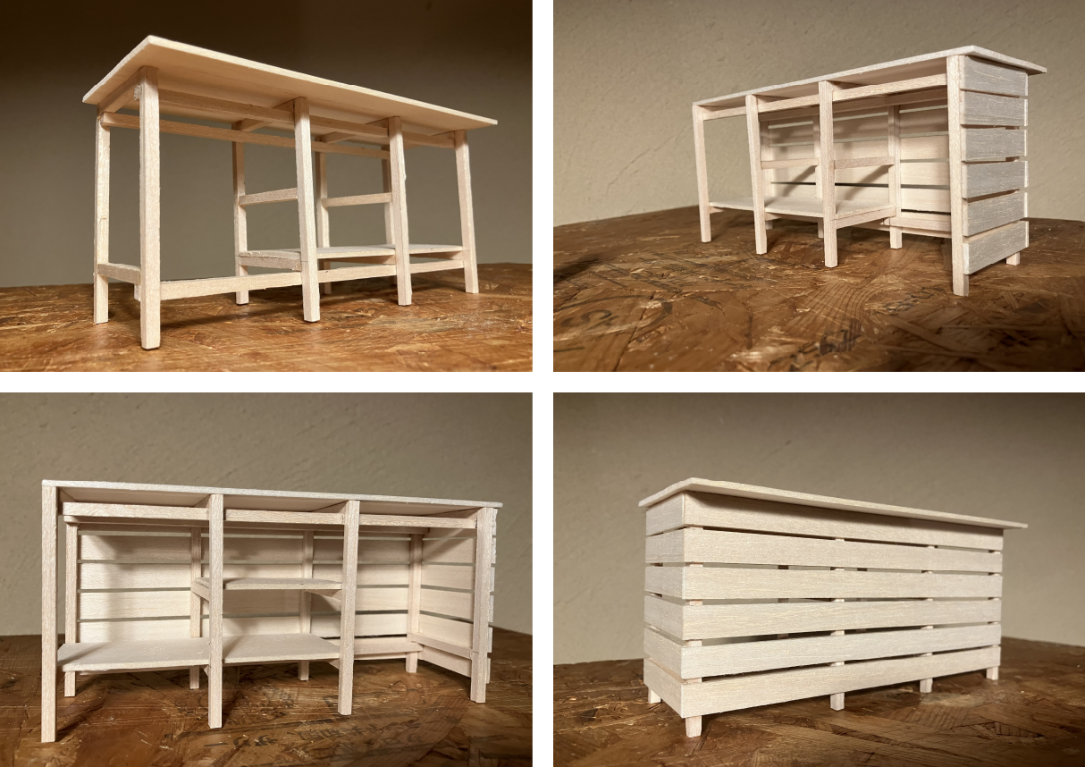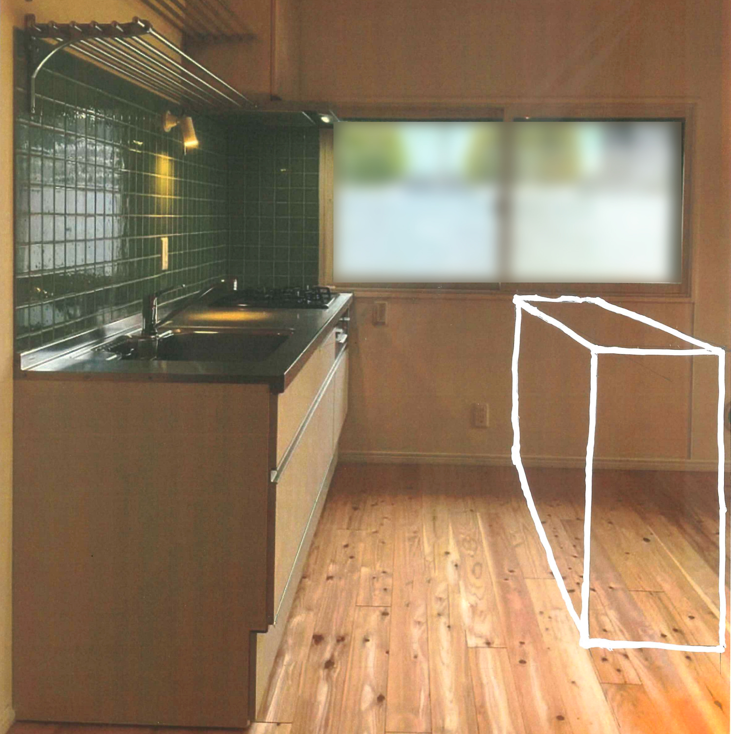 キッチン作業台の後ろに、ゴミ箱や電子レンジが綺麗に収まる収納を制作します✨